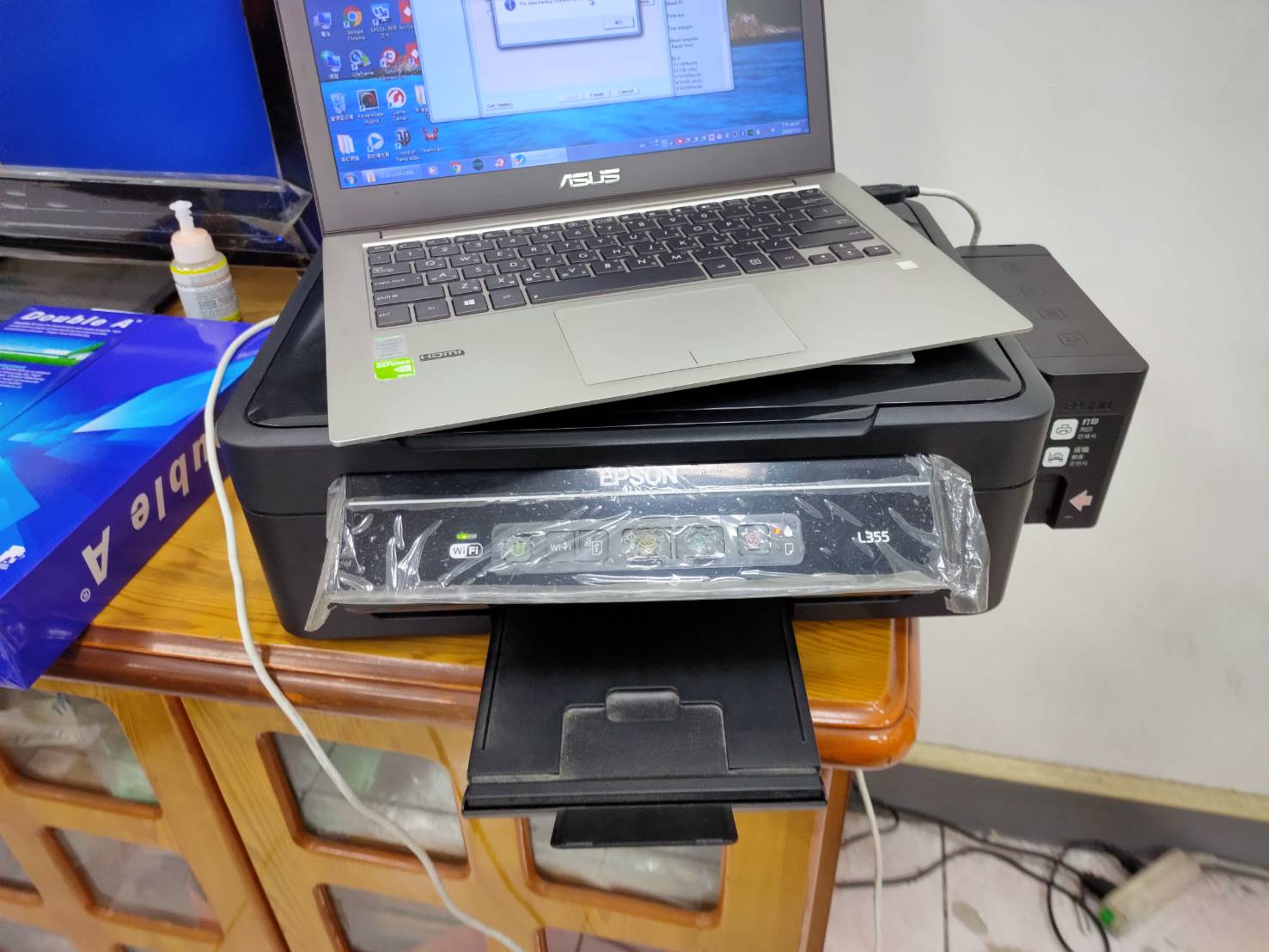 (三)印表機狀況 :1.印表機出現狀況(1).印表機面板的紙張燈及墨水燈交替閃爍,且無法列印時,代表集墨棉 耗盡,印表機內的集墨棉屬消耗性零件;因機器內部廢棄墨水已滿,機器會無法 繼續運作。(2).印表機面板的燈交叉閃爍:內部零件使用壽命已盡or 集墨棉使用壽命已盡。2.電腦上出現訊息(1).印表機燈閃爍,電腦監控程式顯示:內部零件使用壽命已盡(無法列印或掃描)。(2).印表機燈閃爍,電腦監控程式顯示:集墨棉使用壽命已盡(無法列印或掃描)。(四)維修方式 : 1.程式歸零(無更換集墨棉)。2.程式歸零+更換集墨棉。3.程式歸零+安裝廢墨外置瓶。(五)維修費用 :1.遠端操作歸零 400元起。(請先聯繫後轉帳付款,才做歸零動作)2.搬至現場歸零 600元起。(更換集墨棉or廢墨外置瓶費用另計)3.到府服務歸零 800元起。(更換集墨棉or廢墨外置瓶費用另計)以上為舊款及家用型印表機。新款型印表機(例如:L11XX L31XX 等... )、商用型印表機(例如:L4系列 L5系列 L6系列等...)及進階商用型印表機(例如:L8系列L1300系列L1800系列等...),另行報價更換集墨棉費用 $ 400-800 依照送修機種而訂.....改裝廢墨外置瓶費用費用 $ 400-500 依照送修機種而訂.....(五)維修作法 :1.遠端操作(請先自行準備免費 Anydesk 免安裝遠端軟體) 。2.自行搬運印表機至指定地點。3.到府服務區域(新莊、二重、三重、蘆洲、五股等...,(上述以外區域可詢問是否到府,費用另計)。可另外 安裝廢墨外置瓶&廢墨海綿更換 費用另計!(六)維修流程 :這次是電話接洽後,客戶要求到府維修印表機問題,到現場處理不到10分鐘處理好了,主要是路程很遠!! 這次感謝環球 漁業 海釣場
